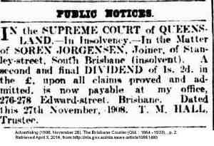 He was involved in a court case concerning insolventcy in Nov 1908 in Brisbane, Queensland, Australia. 16 Søren Jørgensen was declared insolvent in the Supreme Court of Queensland. A Public Notice in the Brisbane Courier newspaper advised that a second and final dividend of 1s. 2d. in the £ was payable at the office of the Trustee.